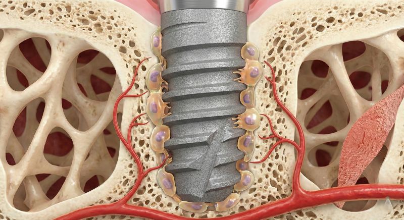 فرآیند حیاتی که موفقیت را تضمین میکند، جوش خوردن استخوان (اسئواینتگریشن) نام دارد. در این فرآیند، استخوان مستقیماً به سطح فلز متصل میشود بدون آنکه لایهای از بافت اضافی بین آنها فاصله بیاندازد. این پدیده باعث میشود که پایه ایمپلنت به عنوان یک ریشه مصنوعی عمل کرده و نیروهای ناشی از جویدن را به استخوان منتقل کند، که خود عاملی برای حفظ تراکم استخوان در آن ناحیه است.