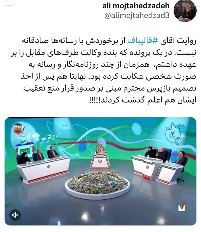 به گزارش خبرگزاری خبرآنلاین، علی مجتهدزاده وکیل دادگستری به سخنان روز گذشته محمدباقر قالیباف در «میزگرد فرهنگی» که از تلویزیون پخش شد واکنش نشان داد و در شبکه اجتماعی ایکس نوشت: