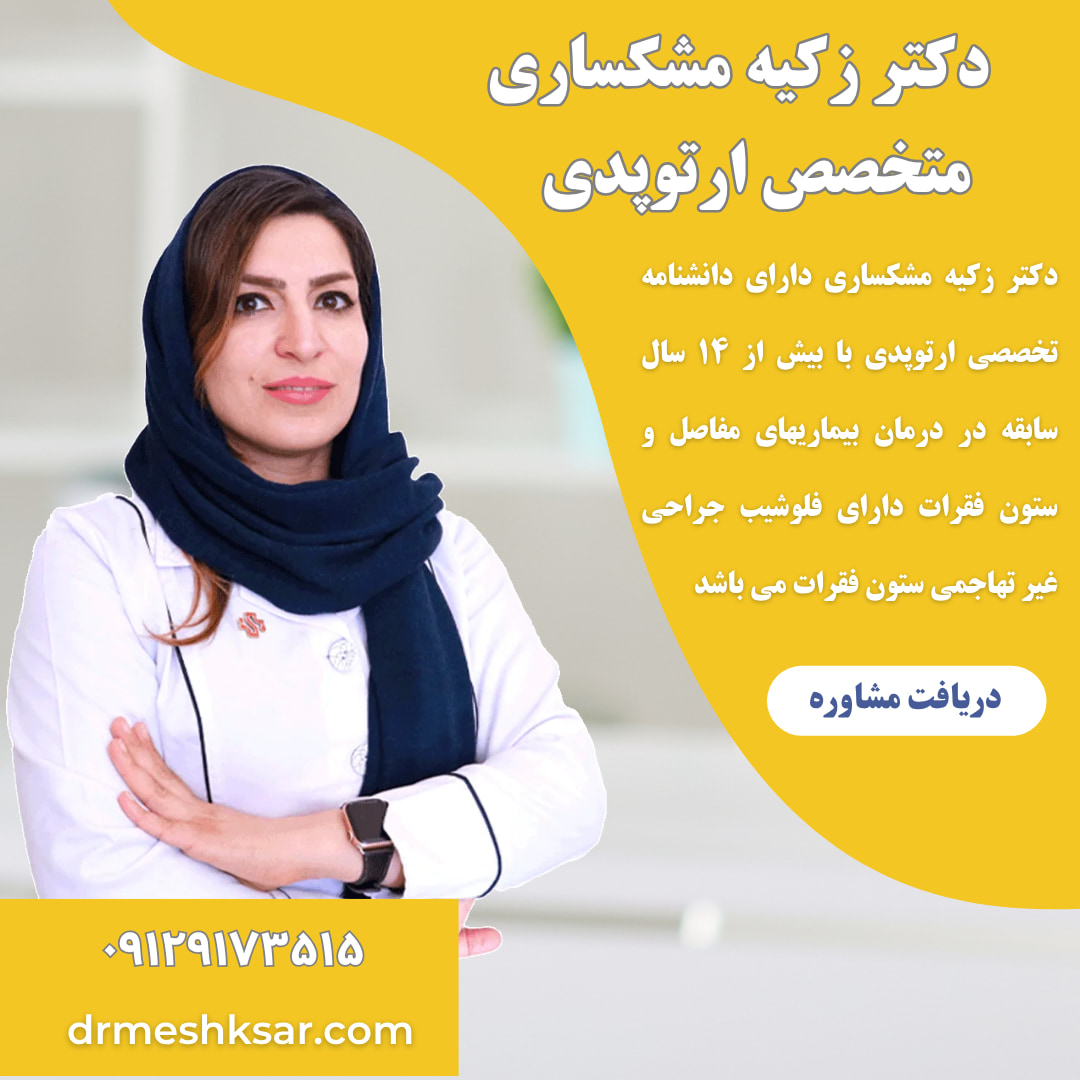 دکتر زکیه مشکساری از جمله متخصصان ارتوپدی در شیراز است که با سال‌ها تجربه در زمینه درمان بیماری‌های ستون فقرات و جراحی‌های کم‌تهاجمی، توانسته است نتایج بسیار موفقی در درمان بیماران خود به دست آورد.